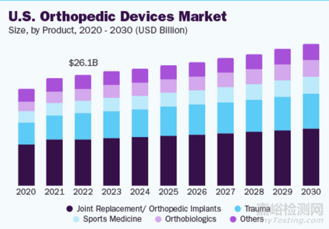 2023年,全球骨科器械市場的規(guī)模估計為604億美元,并預計從2024年到2030年將以4.3%的復合年增長率增長。市場受到多種因素的驅動,包括骨科疾病高發(fā)率、老齡人口的增加、退行性骨病的增多以及道路事故數(shù)量的上升。由久坐生活方式和肥胖引起的肌肉骨骼障礙早期發(fā)病預計將進一步推動市場增長。