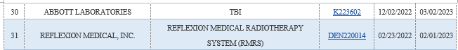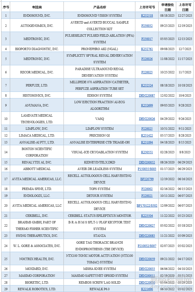 截至2023年12月31日,共計(jì)933款器械獲批BDD(之前通過EAP計(jì)劃納入的器械也計(jì)算在內(nèi)),其中的95款獲得上市許可。在獲得上市許可之前,F(xiàn)DA不會(huì)公開披露BDD申請(qǐng)情況和該申請(qǐng)的批準(zhǔn)情況。以下為FDA官網(wǎng)列示的2023年已獲得上市許可的BDD: