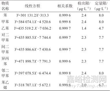 表1 8種苯系物的線性范圍、線性方程、相關(guān)系數(shù)、檢出限和定量限