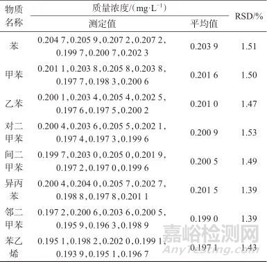 取1份100 mL水樣,加入低濃度的甲醇中8種苯系物的標(biāo)準(zhǔn)使用溶液,平行測(cè)定7次樣品,計(jì)算測(cè)定結(jié)果的均值和相對(duì)標(biāo)準(zhǔn)偏差(RSD),精密度試驗(yàn)結(jié)果見表2。由表2可知,8種苯系物測(cè)定結(jié)果的相對(duì)標(biāo)準(zhǔn)偏差均小于2%,表明該方法對(duì)8種苯系物的測(cè)定具有良好的精密度。