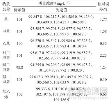 按所建立的方法,對(duì)苯系物混合有證標(biāo)準(zhǔn)物質(zhì)A22050057進(jìn)行測(cè)定,檢驗(yàn)該方法的準(zhǔn)確度,測(cè)定結(jié)果見表3。由表3可知,苯系物混合標(biāo)準(zhǔn)物質(zhì)的各項(xiàng)測(cè)定值均在標(biāo)準(zhǔn)值不確定范圍內(nèi),表明該實(shí)驗(yàn)方法能夠滿足測(cè)定苯系物的準(zhǔn)確度。