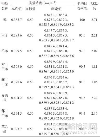取200 mL水樣于200 mL容量瓶中,加入一定量的100 mg/L的甲醇中8種苯系物的標(biāo)準(zhǔn)使用溶液,均分為兩份,取其中一份再加入100 mg/L的甲醇中8種苯系物的標(biāo)準(zhǔn)使用溶液1.00 mL,分別測(cè)量加標(biāo)樣品和再加標(biāo)后樣品各7組,分別計(jì)算其平均值和加標(biāo)回收率。加標(biāo)回收率試驗(yàn)結(jié)果見表4。由表4可知,8種苯系物的加標(biāo)再加標(biāo)平均回收率為90.5%~100%,測(cè)定結(jié)果的相對(duì)標(biāo)準(zhǔn)偏差(RSD)為1.81%~2.71%(n=7),表明該方法具有良好的準(zhǔn)確度和精密度。