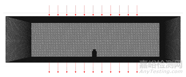 基于有限元前處理軟件分別對(duì)隧道烘箱中的加熱段腔室及西林瓶進(jìn)行網(wǎng)格劃分,網(wǎng)格劃分方式采用多面體網(wǎng)格,并對(duì)西林瓶區(qū)域進(jìn)行網(wǎng)格加密,整個(gè)計(jì)算域被劃分為 891769 個(gè)網(wǎng)格,有4949906 個(gè)節(jié)點(diǎn),生成的網(wǎng)格模型如圖2所示。將生成好的網(wǎng)格模型導(dǎo)入到 CFD仿真軟件中進(jìn)行計(jì)算,腔室頂端作為熱空氣入口邊界條件,并定義為速度入口,在速度入口設(shè)置不同的風(fēng)速大小、風(fēng)的流動(dòng)方向以及溫度情況。腔室下端作為熱風(fēng)出口,并定義為壓力出口邊界條件,設(shè)置為大氣壓。不考慮與兩端腔室的對(duì)流換熱,將兩端傳送帶的進(jìn)出口定義為封閉的壁面,并將腔體壁面視為絕熱層。