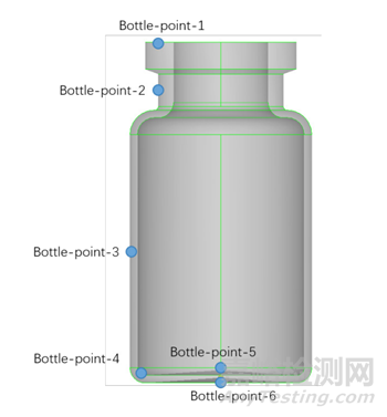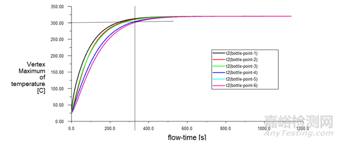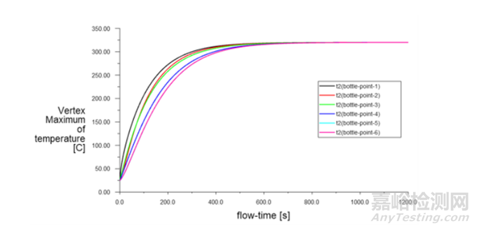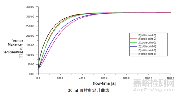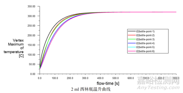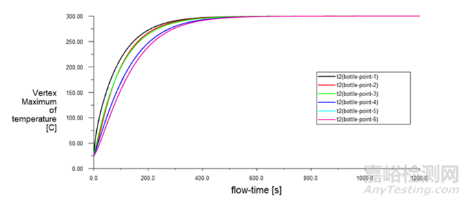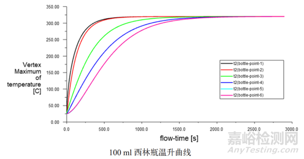 選取西林瓶瓶口上部(Bottlepoint-1)、西林瓶頸部(Bottle-point-2)、西林瓶瓶身中部(Bottle-point-3)、西林瓶瓶?jī)?nèi)邊緣(Bottle-point-4)、西林瓶瓶?jī)?nèi)底中心(Bottle-point-5)、西林瓶瓶底中心(Bottle-point-6)六個(gè)測(cè)點(diǎn)跟蹤其溫升曲線,如圖3 所示。