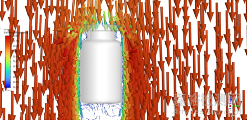 圖4 所示為熱風(fēng) 320 ℃, 風(fēng)速0.45 m/s,初始環(huán)境溫度 25℃工況下的溫升曲線,圖5 為某一時(shí)刻的溫度分布云圖,由圖4、圖5 可以得出瓶底升溫趨勢(shì)明顯低于瓶口上部、瓶頸部、瓶身中部及瓶?jī)?nèi)邊緣。Bottle-point-6 曲線與Bottle-point-5 曲線幾乎重合,說(shuō)明西林瓶瓶底中心和西林瓶瓶?jī)?nèi)底中心在熱風(fēng)下升溫趨勢(shì)一致,并且升溫最慢,為西林瓶升溫時(shí)的溫度最低點(diǎn),與實(shí)際生產(chǎn)中溫度表象基本一致,也就是說(shuō)只有保證瓶底的溫度(最冷點(diǎn))才能確保去熱源的有效性,基于仿真模擬結(jié)果最冷點(diǎn)達(dá)到 300℃需要約 7 min。圖6 為西林瓶附近的速度分布矢量圖,由圖6 可知,氣流在經(jīng)過(guò)西林瓶時(shí),會(huì)繞過(guò)瓶身,并對(duì)瓶壁進(jìn)行快速的加熱,瓶底由于氣流流速小,加熱最慢。