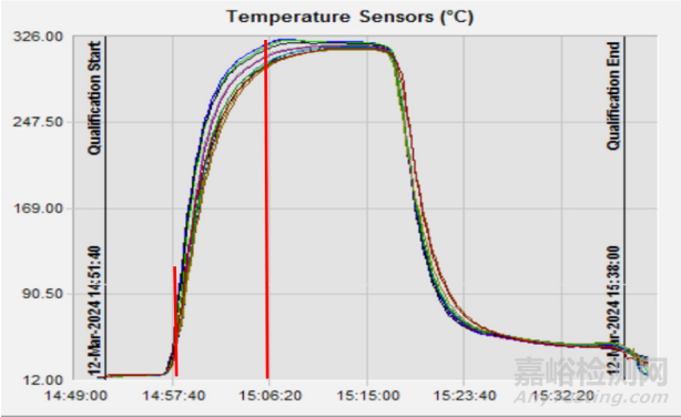 圖7、圖8 分別為對(duì)隧道烘箱測(cè)試時(shí)采用熱風(fēng)為 320℃,風(fēng)速 0.45m/s工況時(shí)的實(shí)際試驗(yàn)現(xiàn)場(chǎng)圖,以及所獲得的不同測(cè)點(diǎn)的溫度溫升曲線圖,由圖8 可知,烘箱溫度要達(dá)到 300℃需要約 8 min 左右,該值與仿真模擬值相比略大,主要原因在于模擬時(shí)簡(jiǎn)化為單個(gè)西林瓶在穩(wěn)定風(fēng)溫風(fēng)速下的受熱情況,沒(méi)有考慮到烘箱的結(jié)構(gòu)、瓶子的排列方式及預(yù)熱段、冷卻段對(duì)加熱段的影響。但是,仿真分析出的西林瓶升溫趨勢(shì)及受熱情況對(duì)實(shí)際生產(chǎn)具有相當(dāng)大的參考價(jià)值,對(duì)風(fēng)溫、風(fēng)速及網(wǎng)帶運(yùn)行速度的合理選擇具有重要的指導(dǎo)作用。