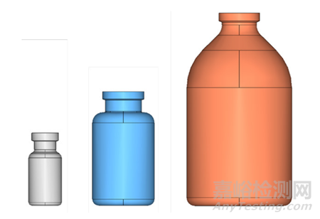 同一款隧道烘箱實(shí)際需滿足多種規(guī)格西林瓶的溫升需求,分別對(duì)2 ml,20 ml,100 ml 三種規(guī)格的西林瓶進(jìn)行溫升模擬分析,分析工況:T入口=320℃,V入口=0.7 m/s,初始環(huán)境溫度:25℃,圖12 是三種規(guī)格西林瓶的示意圖。