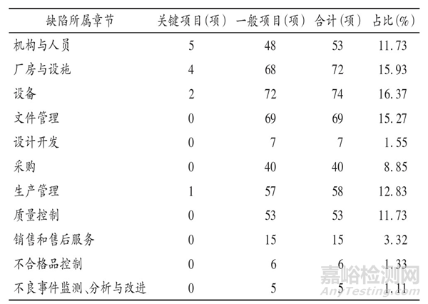 共發(fā)現(xiàn)不符合項目452項,包括關(guān)鍵項目12項和一般項目440項,缺陷項目主要集中于機構(gòu)與人員、廠房與設(shè)施、設(shè)備、文件管理、采購、生產(chǎn)管理、質(zhì)量控制等方面。詳見表1。