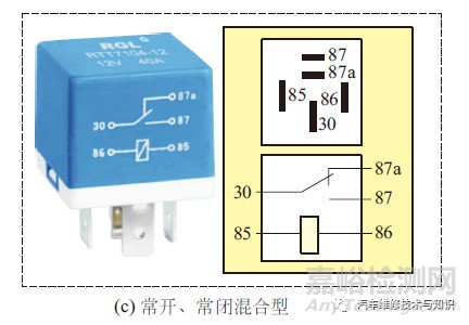 汽車上廣泛使用電磁式繼電器,常見的繼電器有供電繼電器、啟動繼電器、喇叭繼電器、霧燈繼電器、雨刮繼電器等。