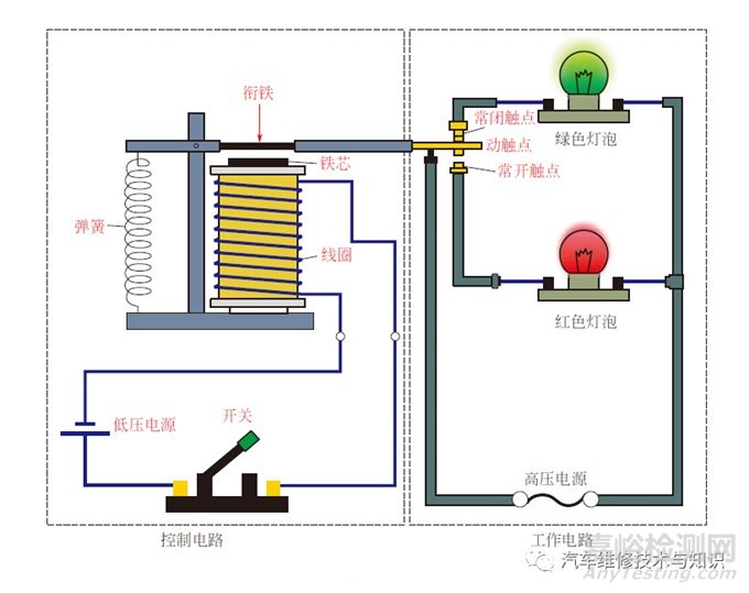 繼電器是汽車控制電路中常用的一種元件,它是利用電磁感應(yīng)原理,控制某一回路的接通或斷開,實現(xiàn)用小電流控制大電流,從而減小控制開關(guān)觸點的電流負荷,保護開關(guān)觸點不被燒蝕。