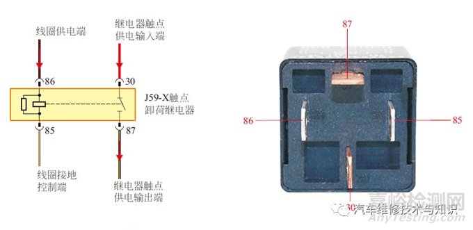 繼電器在汽車上運用廣泛,如下圖所示是大眾汽車上的X觸點卸荷繼電器,“30”端子為繼電器觸點供電輸入端,“87”端子為繼電器觸點供電輸出端,“86”端子為線圈供電端,“85”端子為線圈接地端。