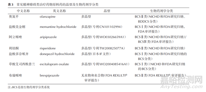 原料藥的基本性質(zhì),如溶解性、晶型、粒度和生物藥劑學分類系統(tǒng)(bio-pharmaceutics classification system,BCS)等可能對制劑質(zhì)量有影響。BCS分類是一種基于藥物活性成分水溶性和腸道滲透性將藥品分類的科學方法,可以根據(jù)其溶解性和滲透性將藥物活性成分分為4類。BCS分類文獻查詢方式包括查詢相應品種的FDA審評報告、FDA研究歸納的報告、美國國家兒童健康和人類發(fā)展研究所(National Institute of Child Health and Human Development,NICHD)和基于藥物體內(nèi)處置的生物藥劑學分類系統(tǒng)(biophar?maceutics drug disposition classification system,BDDCS)等。精神障礙類治療藥物常見原料藥的晶型及生物藥劑學分類見表3。例如奧氮平、阿立哌唑的生物藥劑學分類系統(tǒng)屬于BCSⅡ類或者BCS Ⅳ類,且溶解度具有pH依賴性,原料藥在膠液中可能為混懸狀態(tài)??梢钥疾斓腿芙庑缘脑系牧綄θ艹龅挠绊?,結合粒徑對藥品質(zhì)量影響的研究,酌情在原料藥內(nèi)控標準中訂入粒度控制項目。奧氮平和阿立哌唑均有多晶型情況,在制劑的制備過程中及穩(wěn)定性考察期間是否存在晶型轉(zhuǎn)化也應予以關注。一些原料藥例如利培酮、阿立哌唑味苦,可以選擇加入矯味劑進行掩味以改善口感。