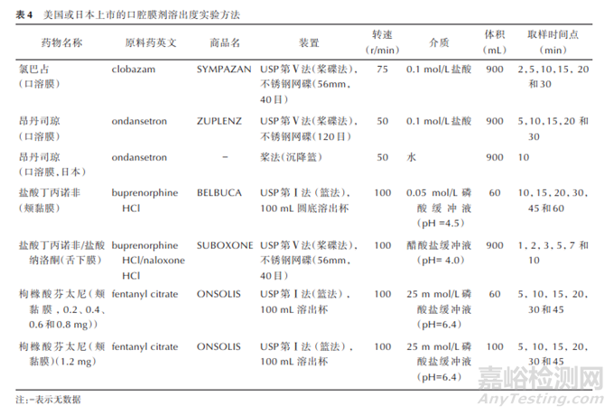 口溶膜可以無需用液體沖服,能夠快速溶化分散,溶出度和溶化時限(崩解時限)控制是口腔膜劑的關鍵質(zhì)量指標。進行溶出度控制時應關注溶出裝置選擇、溶出限度擬定等方面。體外考察參比制劑與自制樣品溶出相似情況,一定程度上降低體內(nèi)生物不等效風險。溶出度研究時通常會結合藥物性質(zhì)和自身產(chǎn)品設計并參考 FDA 溶出度數(shù)據(jù)庫等選擇合適的溶出裝置和溶出方法(溶出介質(zhì)、轉(zhuǎn)速、取樣點等)。目前暫無統(tǒng)一公認的口溶膜溶出方法,筆者統(tǒng)計了FDA及日本上市的部分口腔膜劑的溶出度試驗方法(表4),目前常見的包括槳法、籃法、槳碟法和流通池法等。由于口溶膜較容易漂浮,有時也會增加沉降籃裝置,例如日本上市的昂丹司瓊口溶膜(OD Film)使用了槳法加沉降籃裝置[12-13];而使用沉降籃時樣品可能發(fā)生折疊或彎曲,美國上市的昂丹司瓊口溶膜(ZU?PLENZ®)使用了槳碟法(配不銹鋼網(wǎng)碟)。溶化時限是此類制劑特別關注的指標,其測定方法可以模擬臨床實際使用時的情形擬定,并提供科學的限度[5],不同方法間的對比研究有時可以提供更充足的依據(jù)。