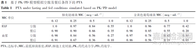 飲食對(duì)給藥方案的影響 根據(jù)片劑食物效應(yīng)研究的結(jié)果,口服本品(空腹與進(jìn)食對(duì)比)的平均峰濃度(Cmax)和藥時(shí)曲線下面積(AUC0-inf)分別降低22.90%和18.43%,從該數(shù)據(jù)來(lái)看,食物對(duì)本品的暴露量影響不大。但基于本品的1次給藥間隔的暴露量的差異來(lái)算,高脂餐后AUC0-12 h約降低30%。用肺泡上皮襯液(ELF)及血漿PK/PD模型,模擬醋酸來(lái)法莫林片在空腹及餐后條件下的PTA,結(jié)果如表1所示。按照肺炎鏈球菌和金黃色葡萄球菌的最低抑菌濃度(MIC)分別為0.50、0.25 mg·mL-1計(jì)算,高脂餐后PK/PD的達(dá)標(biāo)率(PTA)小于70%。即食物攝入影響本品的療效,故本品最終說(shuō)明書(shū)中規(guī)定的飲食條件為“在餐前至少1 h或者餐后至少2 h服用”。