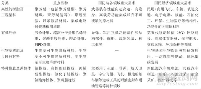 表1 高性能高分子關(guān)鍵材料分類及應(yīng)用需求