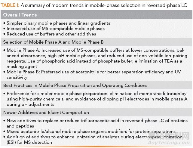 在這篇文章,我們將簡單闡述RP-HPLC中流動相涉及的基礎(chǔ)理論以及流動相選擇的最新趨勢,如TABLE I所示。最明顯的趨勢集中在三個方面:小分子藥及生物藥的穩(wěn)定性預(yù)測分析、提高UV和MS檢測器靈敏度以及堿性分析物峰形的優(yōu)化。