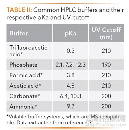 TABLE II列出了常用的流動相添加劑以及它們各自的pKa和截止波長,可用于LC-MS的揮發(fā)性的緩沖鹽被標(biāo)注了星號。這些添加劑可以作為酸化或者堿化試劑或者通過添加它們對應(yīng)的共軛鹽來作為緩沖液。