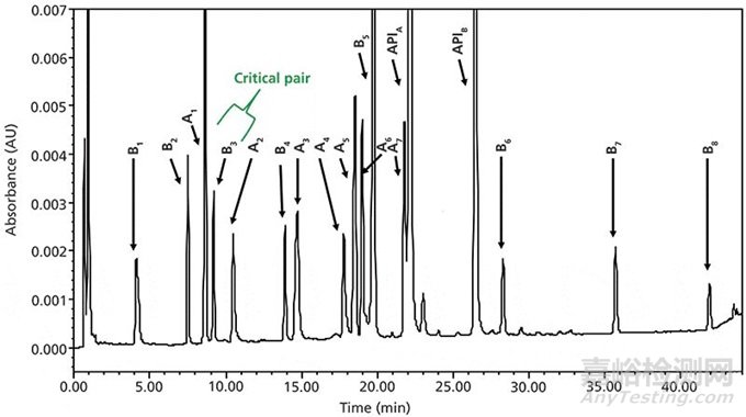 圖1為一個檢測含有兩種API以及過程雜質(zhì)和降解產(chǎn)物的色譜圖(3)。我們可以看到所有的峰在高pH條件下都有非常好的峰形,沒有峰裂分的情況出現(xiàn)。這個方法的缺點(diǎn)是它對流動相pH比較敏感,需要保持在pH 9.10到9.15以防止化合物的共洗脫(3,15)。