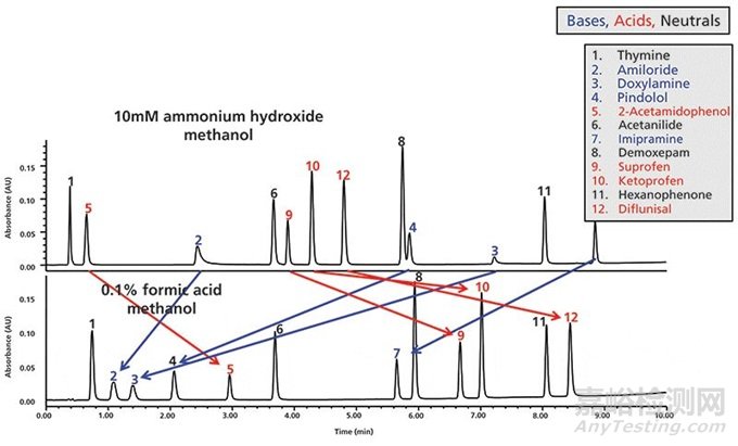 圖2 一個使用酸性和堿性流動相、梯度方法來分離12個含有酸性(紅色)、堿性(藍(lán)色)和中性(黑色)藥物分子的色譜柱篩選案例(數(shù)據(jù)源自參考文獻(xiàn)17)