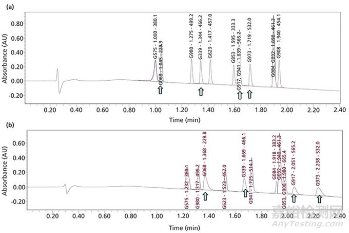 圖3 (a)一種通用使用亞3 µm的表面帶電雜化(CSH)色譜柱來分析12種新化合物;(b)使用常規(guī)表面不帶電的色譜柱的對比分析圖譜