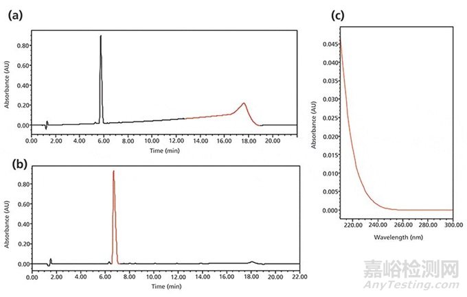 圖4 藥物穩(wěn)定性預(yù)測實(shí)驗(yàn)中出現(xiàn)的梯度漂移問題 。(a)流動相A和B中都添加0.1%的三氟乙酸;(b)使用平衡吸附流動相,其中流動相A為添加0.05%三氟乙酸的水,B為添加0.03%三氟乙酸的乙腈;(c)0.05%三氟乙酸比水的UV光譜。梯度:25-65% B 15 min;基線漂移:(a)0.1 AU,(b)0.0002 AU,檢測波長:230 nm。