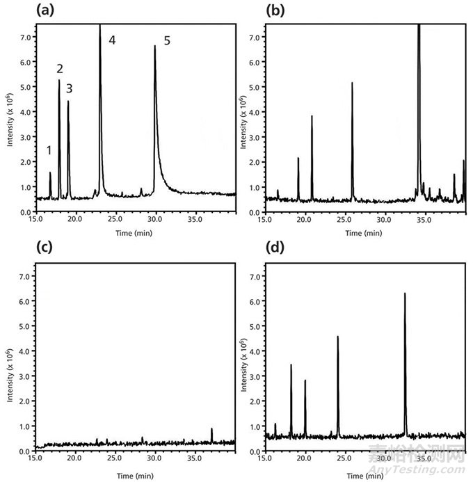 圖6 (a)甲酸,(b)甲酸和甲酸銨的混合物,(c)三氟乙酸,(d)二氟乙酸作為流動相添加劑在MS檢測器條件下測試其峰強(qiáng)度,保留,峰寬和分離度(數(shù)據(jù)源自參考文獻(xiàn)25)。
