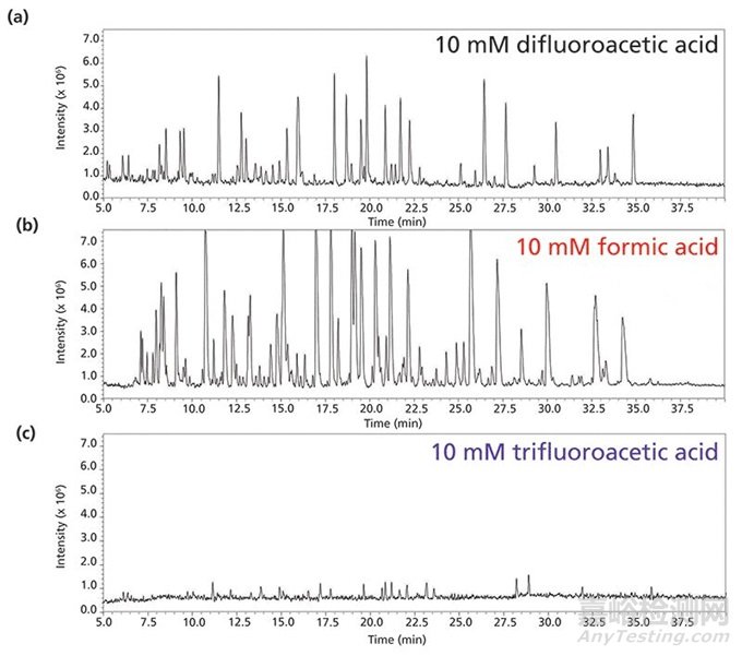 圖7 一個完整的單克隆抗體使用10 mM(a)二氟乙酸,(b)甲酸,(c)三氟乙酸作為酸性流動相添加劑的分離結(jié)果比較