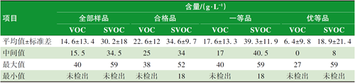 表2中52個內墻涂料樣品的VOC含量、SVOC含量均值分別為14.6 g/L、30.2 g/L,VOC含量的平均值、中間值以及最大值全部低于SVOC,SVOC含量的標準差略大于VOC。和檢出率一致,VOC含量按產品登記從高至低均為合格品、一等品、優(yōu)等品;SVOC含量按產品等級從高至低排序依次為一等品、合格品、優(yōu)等品,一等品的SVOC含量明顯高于合格品。