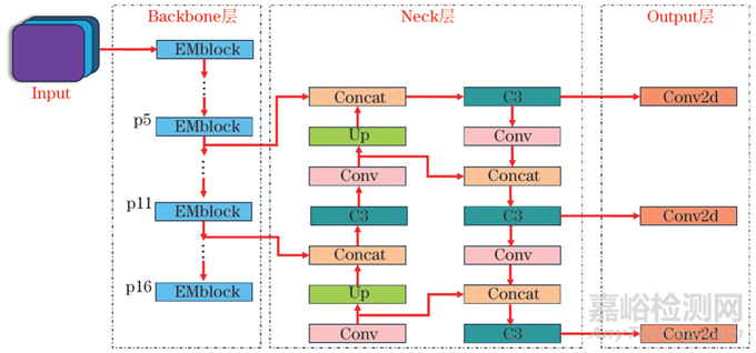 所提EM-YOLO v5s網(wǎng)絡結構如圖2所示,由Backbone層、Neck層和Output層等主要結構組成。其中Backbone層利用替換后的EMblock模塊來提取輸入數(shù)據(jù)的特征信息;Neck層是一個特征金字塔結構,將淺層的圖形特征和淺層的語義特征結合在一起;Output層使用3個1×1卷積層作為輸出。