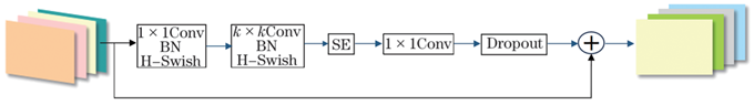 網(wǎng)絡中使用的EMblock模塊結構如圖3所示,其采用一個尺寸為1×1的CBH模塊對輸入數(shù)據(jù)進行升維,再通過尺寸為k×k的CBH模塊提取1×1數(shù)據(jù)特征信息,而SE空間注意力機制模塊在不引入額外參數(shù)的情況下,通過學習得到每個通道的權重,從而引導網(wǎng)絡更加關注當前任務的重要特征,Conv模塊用于最終輸出的準備。