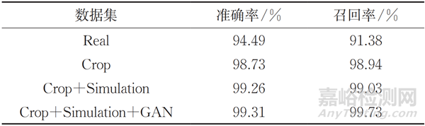試驗的主要目的是驗證深度學習網(wǎng)絡在處理超聲檢測數(shù)據(jù)方面的有效性,不同增強數(shù)據(jù)的識別準確率對比如表2所示,表中為實際數(shù)據(jù)集(Real)、裁剪數(shù)據(jù)集(Crop)、裁剪加仿真數(shù)據(jù)集(Crop+Simulation)以及混合數(shù)據(jù)集(Crop+Simulation+GAN)進行網(wǎng)絡訓練和測試的結果。