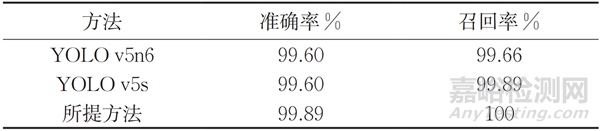 采用所構建的數(shù)據(jù)集,在相同的訓練方式下,用所提方法與YOLO v5s及同類方法進行比較,其結果如表3所示,可見所提方法的精確率達到了99.89%,召回率達到了100%,與其他方法相比,所提方法在精確率和召回率上分別提高了0.29%和0.11%,表明采用嵌入EMblock模塊有助于網(wǎng)絡模型對提取特征進行細化并突出關鍵特征信息。