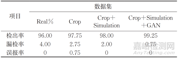 為了進一步驗證所提方法在實際列車車軸檢測中的有效性,對實際車軸進行了缺陷檢測,并用檢出率、誤報率和漏檢率評價測試結果。4種不同數(shù)據(jù)集在目標檢測任務上的識別結果如表4所示,展示了在4種數(shù)據(jù)集的情況下實際缺陷的檢出率、漏檢率和誤報率。
