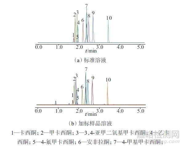 考察Shim-pack XR-ODS和Poroshell 120 EC-C18兩款色譜柱對10種合成卡西酮類化合物的分離效果,結(jié)果顯示,兩種色譜柱分離效果均良好,綜合考慮,選用儀器自帶的Shim-pack XR-ODS色譜柱(100 mm×2.0 mm,3 µm)作為分析柱??ㄎ魍愋戮窕钚晕镔|(zhì)的結(jié)構(gòu)相似,存在同分異構(gòu)體,采用等度洗脫很難將各化合物進行良好的分離,因此采用梯度洗脫,并優(yōu)化洗脫程序。10種卡西酮類活性物質(zhì)標(biāo)準溶液、加標(biāo)樣品溶液色譜圖如圖3所示,從圖3中可以看出,10種化合物能與樣品基質(zhì)雜質(zhì)分開,色譜峰型尖銳、對稱,可達到良好的分離效果。
