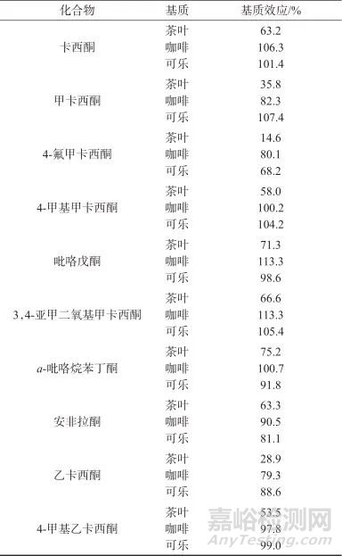表3 10種卡西酮類新精神活性物質(zhì)的基質(zhì)效應(yīng)