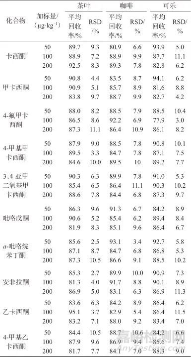 按照樣品最高定量濃度2 µg/kg的2.5、5、10倍進行樣品加標(biāo)回收試驗,取一定量的10種卡西酮類新精神活性物質(zhì)標(biāo)準溶液添加到茶葉、咖啡和可樂樣品中,每種濃度平行制備5份,加標(biāo)回收與精密度試驗結(jié)果見表5。由表5可知,方法的平均回收率為77.9%~94.1%,測定結(jié)果的RSD為3.3%~11.5%(n=5)。