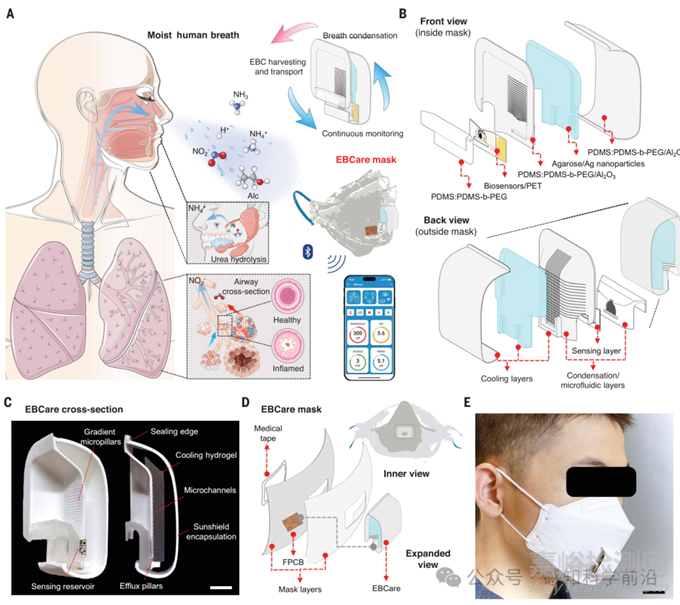 近期的呼吸道疫情引起了廣泛關(guān)注,然而大多數(shù)呼吸監(jiān)測仍局限于物理信號的收集。呼氣冷凝液(Exhaled breath condensate,EBC)蘊含豐富的分子信息,能夠揭示個體健康的多種生理信息。然而,樣本采集相關(guān)的挑戰(zhàn)以及缺乏現(xiàn)場分析工具阻礙了EBC分析的廣泛應(yīng)用。在這里,作者介紹EBCare,這是一種基于口罩的設(shè)備,用于實時現(xiàn)場監(jiān)測EBC生物標(biāo)志物。EBCare采用串聯(lián)冷卻策略、自動化微流體技術(shù)、高選擇性的電化學(xué)生物傳感器以及無線讀取電路,實現(xiàn)了在現(xiàn)實生活中的室內(nèi)和室外活動中對EBC分析物的持續(xù)多模態(tài)監(jiān)測。作者驗證了EBCare在評估健康參與者、慢性阻塞性肺病或哮喘患者以及COVID-19感染后患者的代謝狀態(tài)和呼吸道炎癥方面的可用性。