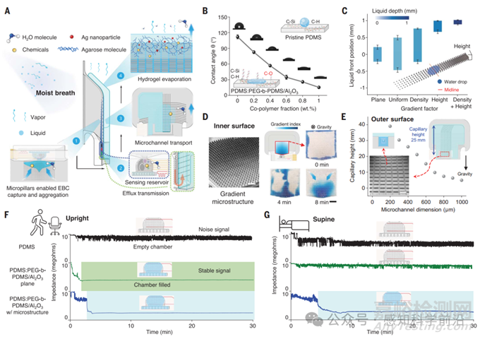 圖3. EBCare設(shè)備微流體設(shè)計的描述,用于EBC采樣、運輸和刷新。 (A) EBCare設(shè)備微流體設(shè)計的示意圖,用于EBC采樣、運輸和刷新。(B) 不同質(zhì)量分?jǐn)?shù)的PDMS-b-PEG共聚物對PDMS:PDMS-b-PEG/ 的接觸角。(C) 具有不同梯度因子(密度和高度)的預(yù)濕微柱陣列設(shè)計的單向液體運輸能力比較。(D) EBCare內(nèi)表面微柱結(jié)構(gòu)的掃描電子顯微鏡(SEM)圖像(左),以及EBCare內(nèi)表面液體運輸?shù)氖疽鈭D和俯視快照(右)。重力垂直于表面并向內(nèi)。比例尺,1mm(左)和3mm(右)。(E) EBCare外表面水凝膠刷新時毛細水運輸?shù)母叨?。插圖顯示外表面結(jié)構(gòu)的微通道橫截面示意圖(左上)、SEM圖像(左下)和毛細泵送示意圖(右上)。比例尺,1mm。(F和G) 使用具有不同內(nèi)表面特性(親水性、有或沒有微結(jié)構(gòu))的EBCare設(shè)備在直立(F)和仰臥(G)狀態(tài)下參與者的傳感儲液池中一對電極之間的阻抗,以驗證傳感室內(nèi)EBC的存在。