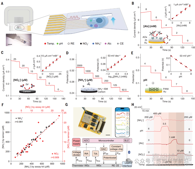 圖4. 無線電化學(xué)生物傳感器陣列的設(shè)計與表征,用于原位多重呼氣液分析。(A) 一種噴墨打印的電化學(xué)傳感陣列的示意圖和光學(xué)圖像,能夠同時原位多重監(jiān)測呼氣液中的 、pH、酒精、 及溫度。(B和C) 在含有不同分析物濃度的人工呼氣液(400 mM )中,酶促酒精傳感器(B)和 傳感器(C)的安培響應(yīng)。(D和E) 在標(biāo)準(zhǔn)分析物溶液中,離子選擇性 傳感器(D)和基于聚苯胺的pH傳感器(E)的開路電位響應(yīng)。(F) 和 傳感器的驗證,使用商業(yè)檢測試劑盒分析來自參與者的收集呼氣液樣本。(G) 集成電子系統(tǒng)和移動應(yīng)用程序的圖像及示意圖,用于無線呼氣液分析。ADC,模數(shù)轉(zhuǎn)換器;BLE,藍牙低能量;DAC,數(shù)模轉(zhuǎn)換器;INA,儀表放大器;TIA,跨阻放大器;WE,工作電極。比例尺,3 mm。(H) 在微流控測試中,電化學(xué)生物傳感器陣列的系統(tǒng)級多重干擾研究。