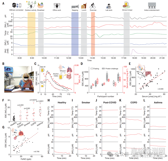 圖5. EBCare在健康和患者人群中進行EBC分析的體內(nèi)評估。(A) 健康參與者全天候交叉活動的EBC分析,使用EBCare監(jiān)測。(B) 一名COPD患者在臨床研究中佩戴EBCare面罩的照片。(C) 健康參與者佩戴EBCare面罩監(jiān)測的呼氣酒精濃度與不同劑量酒精消費后的BAC呼氣測試結(jié)果對比。(D) 在蛋白質(zhì)挑戰(zhàn)期間對EBCare的評估:在一天內(nèi)攝入120克蛋白質(zhì)前后EBC 和血清尿素濃度的變化。(E) EBC 與血清尿素濃度之間的相關(guān)性。(F) 參與者中EBC 濃度的測量,可能存在氣道炎癥的個體。EBC 濃度的統(tǒng)計分析:單因素方差分析及Tukey事后檢驗。(G) EBC 與呼氣性一氧化氮(FeNO)之間的相關(guān)性。(H至L) 使用EBCare面罩對健康參與者(H)、當(dāng)前吸煙者(I)、新近康復(fù)的COVID-19患者(J)、COPD患者(K)和哮喘患者(L)進行的具有實時傳感器校準(zhǔn)的體內(nèi)多重EBC分析。