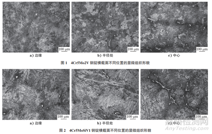 分別在電渣錠冒口端橫截面的邊緣、半徑、心部位置取金相試樣,在模塊橫截面心部取金相試樣,試樣經(jīng)預磨、拋光、腐蝕處理,利用光學顯微鏡對試樣進行金相檢驗。