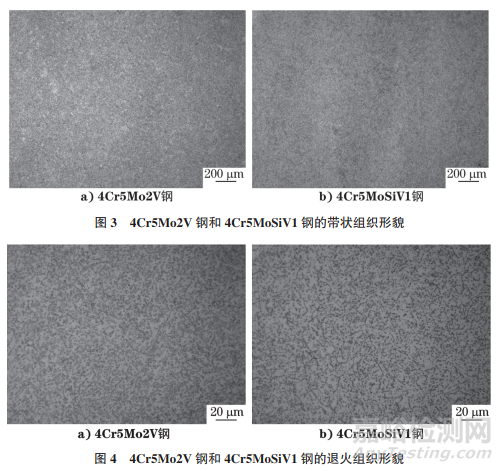 (2)兩種鋼的帶狀組織和球化組織均符合退火組織的標準要求;4Cr5Mo2V鋼調(diào)質(zhì)組織均勻,4Cr5MoSiV1鋼調(diào)質(zhì)組織中存在以V元素為主的一次碳化物。