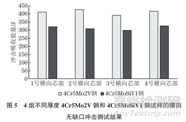 圖5為4組不同厚度4Cr5Mo2V鋼和4Cr5MoSiV1鋼試樣的橫向無缺口沖擊測試結(jié)果。由圖5可知:4Cr5Mo2V鋼的沖擊韌性較4Cr5MoSiV1鋼提高約30%。