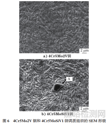 4Cr5Mo2V鋼和4Cr5MoSiV1鋼調(diào)質(zhì)組織的SEM形貌如圖6所示。由圖6可知:4Cr5Mo2V鋼調(diào)質(zhì)組織均勻,4Cr5MoSiV1調(diào)質(zhì)組織中仍可見一次碳