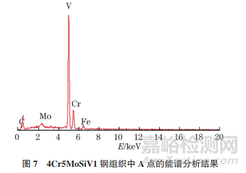 化物。能譜分析結(jié)果顯示,4Cr5MoSiV1鋼調(diào)質(zhì)組織中一次碳化物主要含有V元素,還有少量Cr、Mo元素(見圖7)。