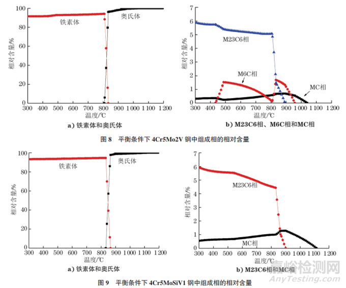 應用JMatPro軟件對平衡條件下4Cr5Mo2V鋼和4Cr5MoSiV1鋼中存在的相及其相對含量進行計算。