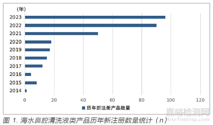 海水鼻腔清洗類產(chǎn)品由噴霧器和噴霧液組成,噴霧液由純凈水和海水或海鹽制成。海鹽是由海水經(jīng)過日曬、蒸發(fā)、結(jié)晶而成的鹽,富含微量元素,能起到殺菌、消炎、抗過敏的作用。海水鼻腔清洗液在我國按Ⅱ類醫(yī)療器械管理,產(chǎn)品分類為14輸注、護理和防護器械-15病人護理防護用品-04海水鼻腔清洗液[4]。根據(jù)醫(yī)療器械標(biāo)管中心公布的分類界定結(jié)果,產(chǎn)品組成中添加宣稱抗病毒成分如海藻多糖、一氧化氮(無水枸櫞酸與亞硝酸鈉反應(yīng)產(chǎn)生)等,宣稱具有抗菌作用的抗菌藥物/ 抗菌成分如丙酮酸等,均按藥械組合產(chǎn)品管理。目前可檢索到鼻腔清洗類已注冊產(chǎn)品達300 余件,產(chǎn)品名稱主要有(生理性、高滲)海水鼻腔清洗液、(生理性、高滲)海水鼻腔噴霧器、生理性海水鼻部護理液、生理性海水鼻部黏膜清洗液等,也有部分產(chǎn)品名稱為鹽水鼻腔清洗液、鹽水鼻腔噴霧器等。產(chǎn)品注冊數(shù)量從2014 年開始總體上逐年增加,具體見圖1。已注冊產(chǎn)品中,96%的產(chǎn)品以海水或海鹽與純凈水制成,3.8% 的產(chǎn)品以鹽水和純凈水制成,以非無菌或無菌形式提供。