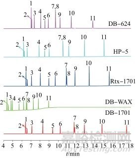 選擇不同的色譜柱進行目標(biāo)物質(zhì)的分離。分別考察Agilent DB-624、HP-5、DB-WAX、DB-1701以及RESTEK Rtx-1701這5種色譜柱對目標(biāo)物質(zhì)的分離效果,圖1為5種色譜柱分離譜圖。從圖1中可以看出,采用DB-624和HP-5兩種色譜柱無法將1,2,3,5-四氯苯、1,2,4,5-四氯苯兩種物質(zhì)分離開;DB-WAX可以將11種物質(zhì)在10 min以內(nèi)分離開,但通過標(biāo)準(zhǔn)系列濃度測定發(fā)現(xiàn)線性關(guān)系較差;DB-1701可以將11種物質(zhì)在18 min以內(nèi)分離開,Rtx-1701可以將11種物質(zhì)在16 min以內(nèi)分離開。綜合比較下,選擇Rtx-1701柱進行實驗。
