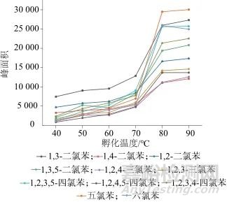 固定孵化時間為15 min,分別選擇40、50、60、70、80、90 ℃進行試驗。圖3為不同頂空孵化溫度的響應(yīng)值,從圖3中可以看出,隨著溫度的升高,各物質(zhì)在儀器中的響應(yīng)值逐步增大,當(dāng)溫度達到80 ℃以后響應(yīng)值的增大幅度減小。此外,過高的溫度不僅會增加氣相中水蒸氣的濃度,從而影響色譜柱的分離性能,還會減少自動進樣器的使用壽命。因此選擇孵化溫度為80 ℃。