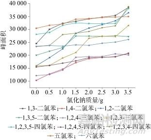 11種目標(biāo)化合物均難溶于水,在頂空瓶中加入氯化鈉可起到鹽析的作用,使其在水中更易逸出[14]。固定頂空孵化時間15 min,孵化溫度80 ℃,分別加入0、0.5、1.0、1.5、2.0、2.5、3.0、3.5、4.0 g氯化鈉進行實驗。圖4為不同氯化鈉用量的響應(yīng)值,從圖4中可以看出,隨著氯化鈉加入量的增加,各物質(zhì)的響應(yīng)值也逐步增加。但進一步試驗表明,隨著氯化鈉的加入各物質(zhì)標(biāo)準(zhǔn)曲線的線性關(guān)系在變差,加入氯化鈉還可能引入少許雜質(zhì),使試驗操作更加繁瑣。在靈敏度滿足要求的情況下,選擇不加入氯化鈉。